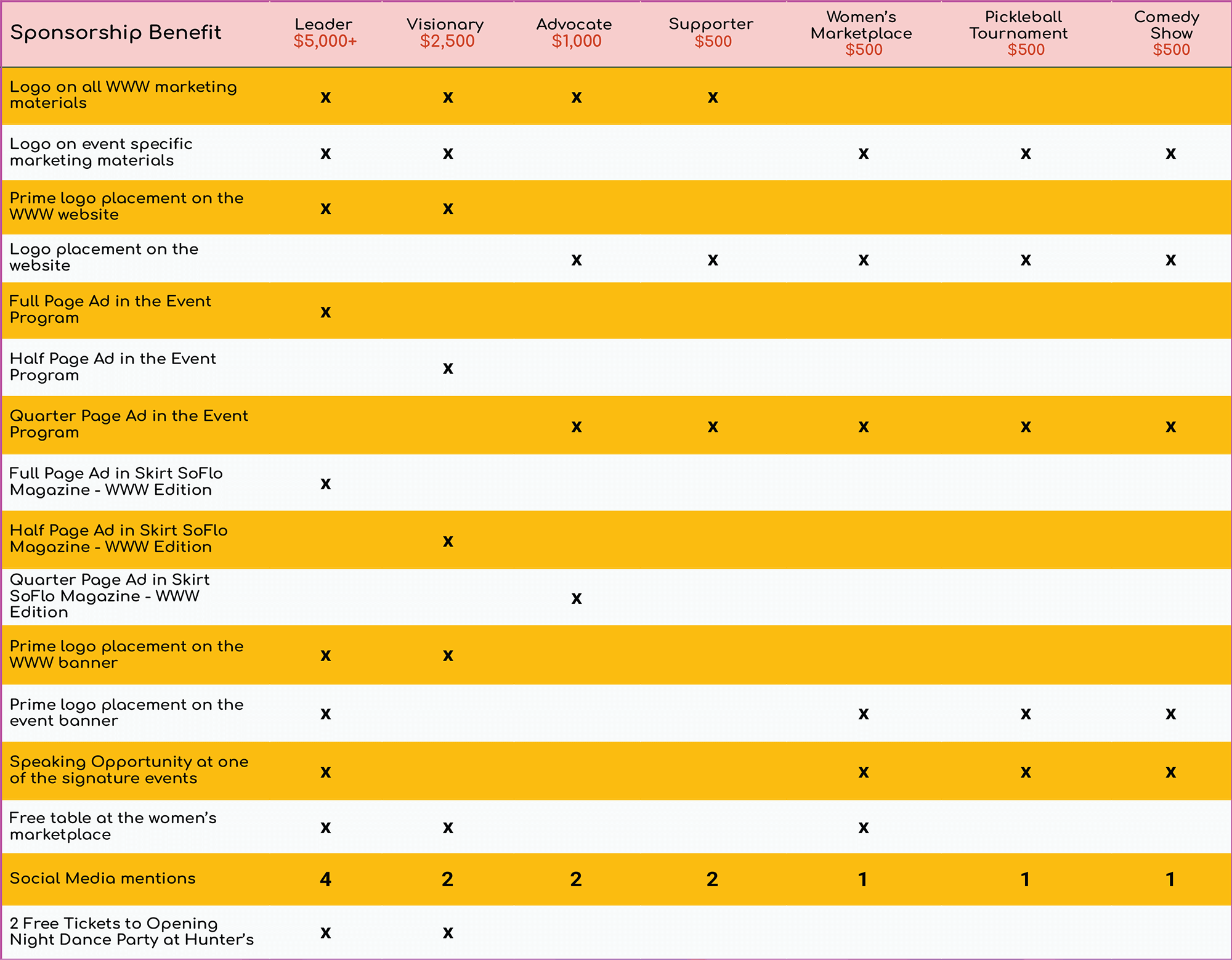 T-shirt, banner, email, swag bags and other opportunities to support Wilton Women’s Week and gain exposure